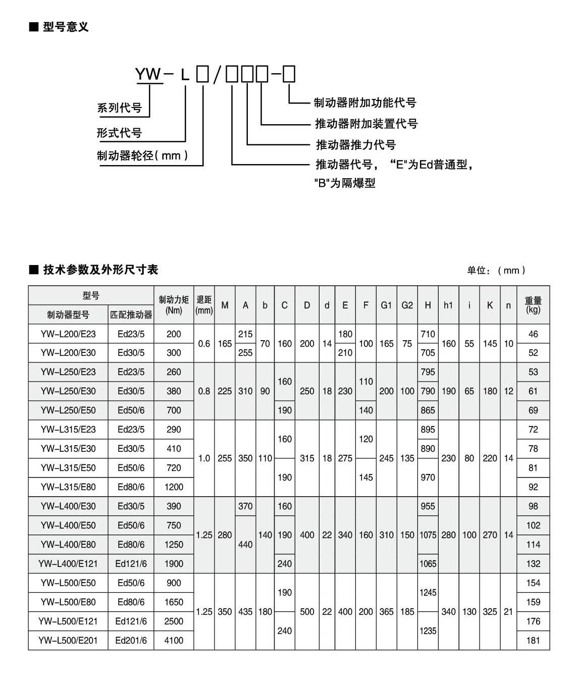 應(yīng)用:YW,YWZ13系列電力液壓鼓式制動(dòng)器,廣泛應(yīng)用于有防爆要求的各種起重運(yùn)輸、皮帶運(yùn)輸、港口裝卸、冶金及建筑機(jī)械中各種機(jī)構(gòu)的減速和停車(維持)制動(dòng)。符合標(biāo)準(zhǔn):YW-L系列制動(dòng)器連接尺寸及制動(dòng)力矩參數(shù)符合JB/T6406-2006標(biāo)準(zhǔn)和DIN15435標(biāo)準(zhǔn)。配套符合DIN15430標(biāo)準(zhǔn)的Ed系列推動(dòng)器。主要特點(diǎn):▲ 聯(lián)鎖式退距均等裝置和瓦塊自動(dòng)隨位裝置,可始終保持兩側(cè)瓦塊退距均等且無(wú)需調(diào)整,完全避免因退距不均使一側(cè)制動(dòng)襯墊浮貼制動(dòng)輪的現(xiàn)象;▲ 主要擺動(dòng)鉸點(diǎn)均設(shè)有自潤(rùn)滑軸承,傳動(dòng)效率高,壽命長(zhǎng),使用中無(wú)需潤(rùn)滑;▲ 制動(dòng)彈簧在方管內(nèi)布置并設(shè)有標(biāo)尺,用戶可十分方便地讀出制動(dòng)力矩值,免去測(cè)量和計(jì)算的麻煩;▲ 制動(dòng)襯墊為卡裝式整體成型結(jié)構(gòu),更換十分方便、快捷,備有半金屬(無(wú)石棉)硬質(zhì)和半硬質(zhì),軟質(zhì)(無(wú)石棉)等不同材質(zhì)的制動(dòng)襯墊供用戶選擇;▲ 配套Ed系列電力液壓推動(dòng)器產(chǎn)品,動(dòng)作靈敏、使用壽命長(zhǎng);▲ 常閉式設(shè)計(jì),(斷電)彈簧制動(dòng),(通電)推動(dòng)器釋放。工作條件:◆ 海拔高度:<2000m;◆ 環(huán)境溫度:-20°C?+ 40°C;◆ 相對(duì)濕度:≤90%;◆ 工作制:間歇性(S3-60%)和連續(xù)(S1);◆ 電源電壓:三相交流,AC380 50Hz (其他電源等級(jí)可按需要定制);◆ 有特殊要求時(shí)在訂貨時(shí)協(xié)商確定?;緟?shù):● 產(chǎn)品型號(hào):YW-L200、YW-L250、YW-L315、YW-L400、YW-L500● 適用輪徑:200~500mm● 制動(dòng)力矩:200~4100Nm