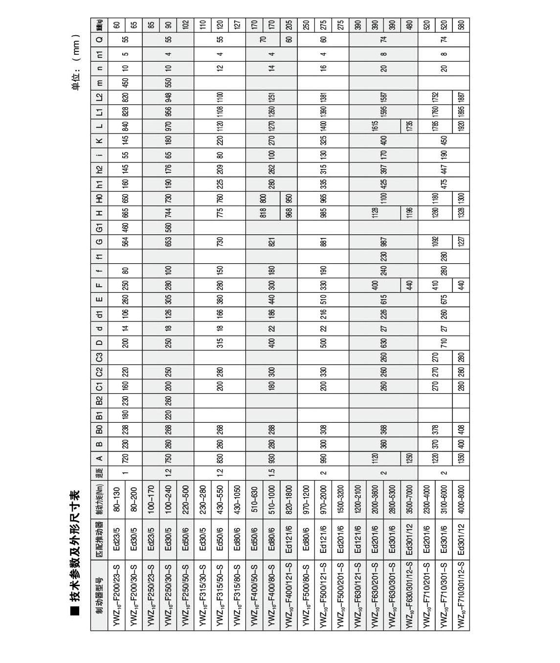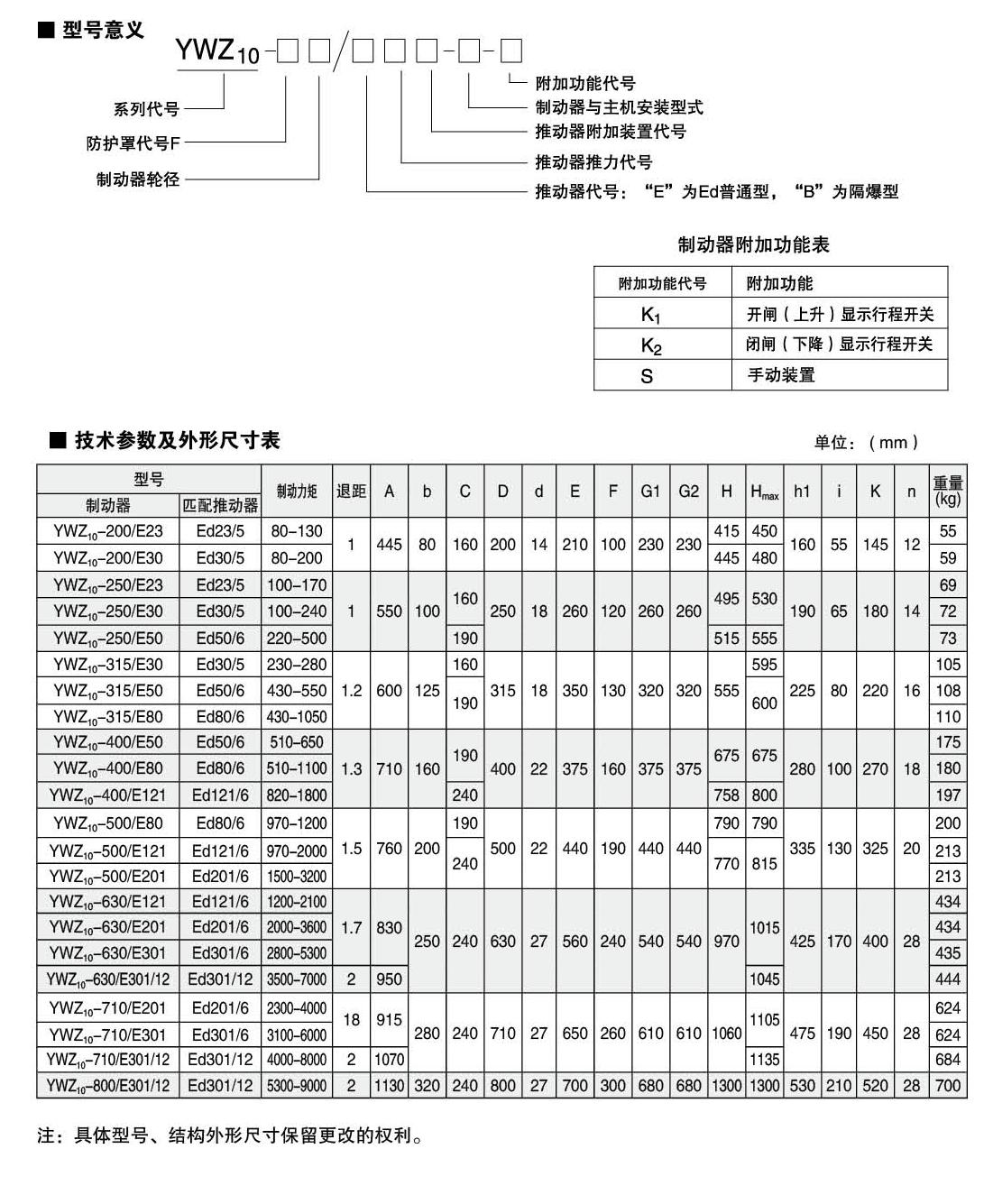 YWZ10,YWZ12系列電力液壓鼓式制動器的連接尺寸和制動力矩參數(shù)符合GB6333-86標準,技術要求符合JB / T6406-2006標準,配套符合DIN15430標準的Ed系列推動器。
